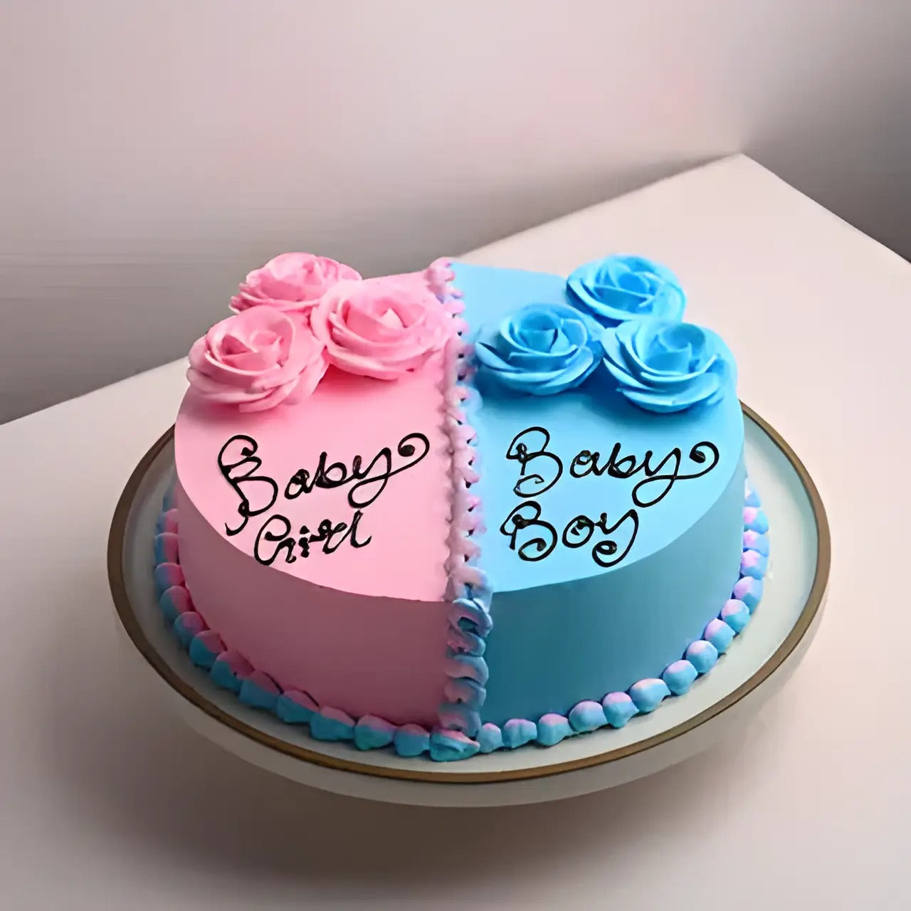 A gender reveal cake with pink and blue frosting, topped with "Baby Girl" and "Baby Boy" signs and decorated with roses.