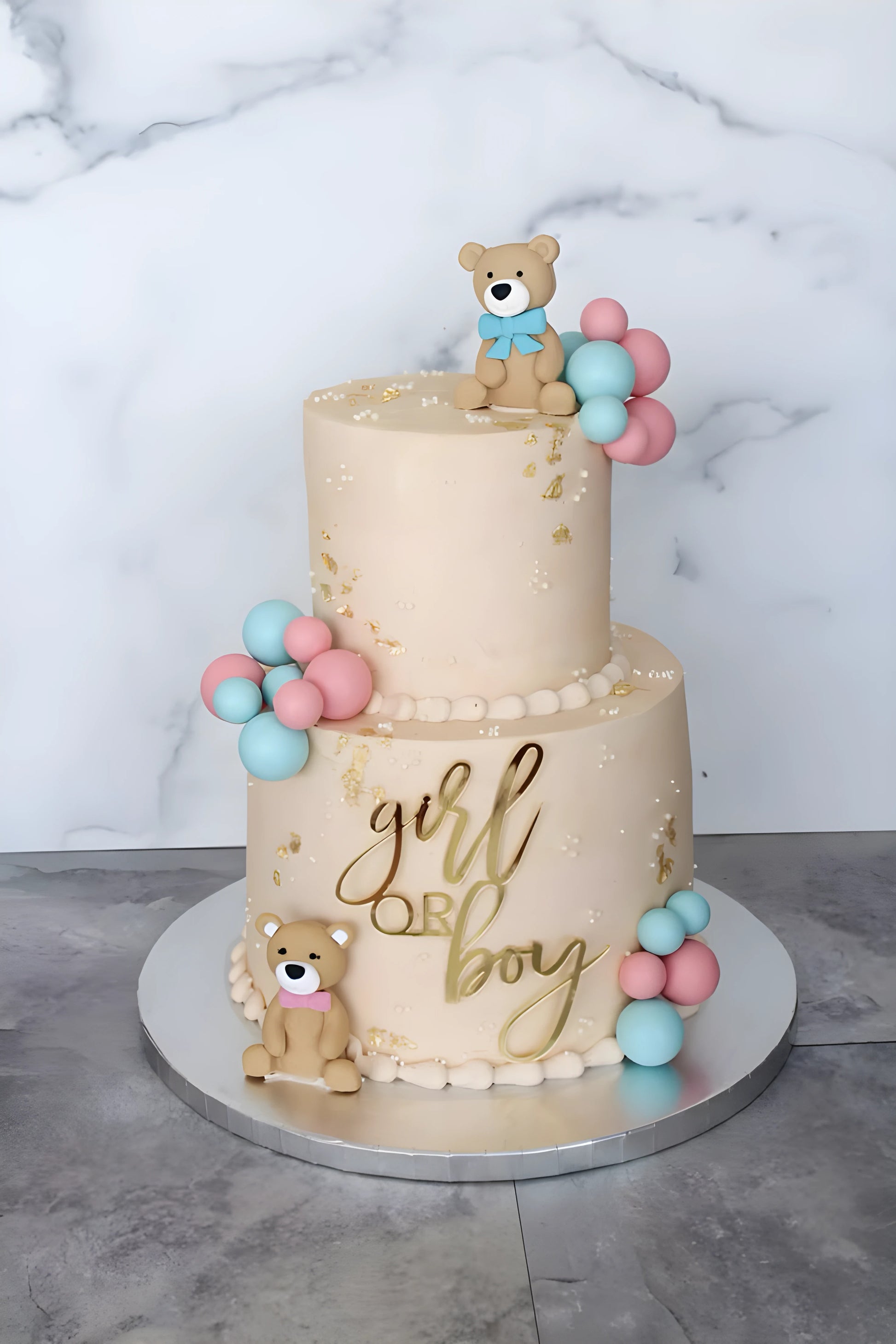 This elegant two-tiered cake is a celebration for a gender reveal party. It features a soft, neutral-colored frosting adorned with delicate gold accents and two adorable teddy bears. The "girl or boy" message is prominently displayed in gold lettering, adding a touch of sophistication and anticipation. The pink and blue balloons hint at the exciting reveal to come, making it a perfect centerpiece for this special occasion.