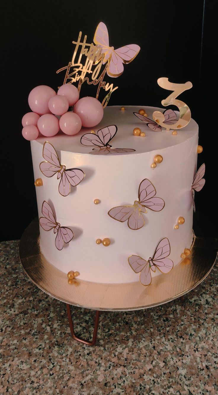 Beautiful pink cake with butterfly accents, gold sprinkles, and a "Happy Birthday" topper. Perfect for a little girl's birthday!