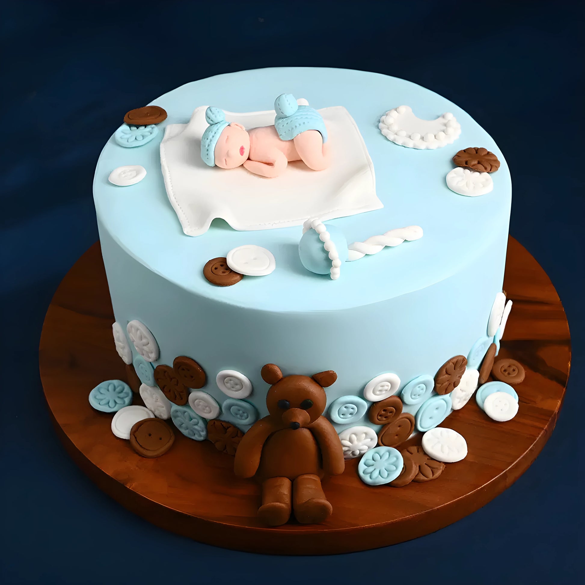 This charming cake is a sweet welcome to a newborn! It features a light blue frosting, creating a calm and serene backdrop for the adorable decorations.
