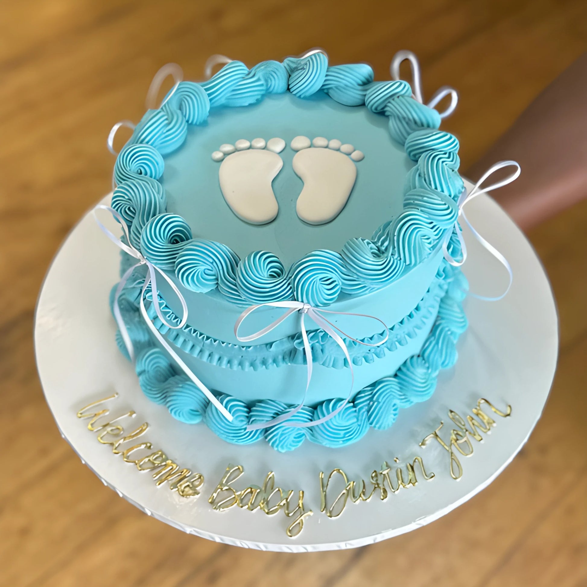 This adorable cake is a sweet celebration for a baby boy's arrival! It features a light blue frosting adorned with a delicate swirl design and a pair of cute baby feet, creating a charming and heartwarming look. The cake is further personalized with the message making it a special and memorable treat for the new parents.