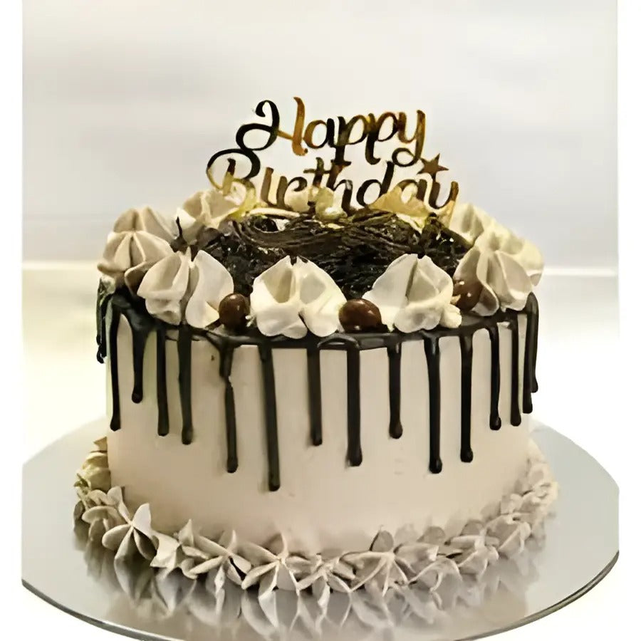 This delectable cake is a chocolate lover's dream! The rich chocolate frosting is drizzled with dark chocolate and adorned with coffee beans and whipped cream rosettes. It's a perfect blend of flavors and textures.