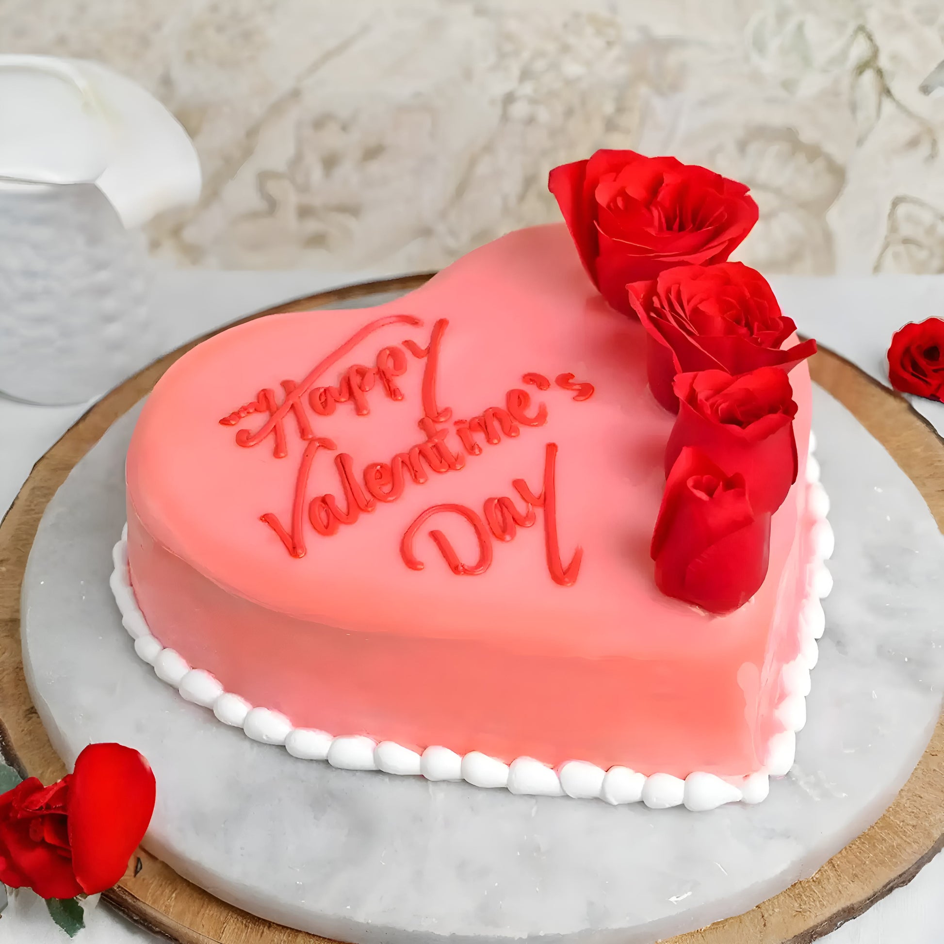 This heart-shaped cake is a sweet and romantic treat for Valentine's Day. The pink icing is decorated with the message "Happy Valentine's Day" in red icing, and the cake is topped with three beautiful red roses.