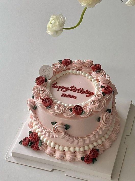 A sweet and romantic birthday cake featuring a pink base and elegant red rose decorations with pearl accents.
