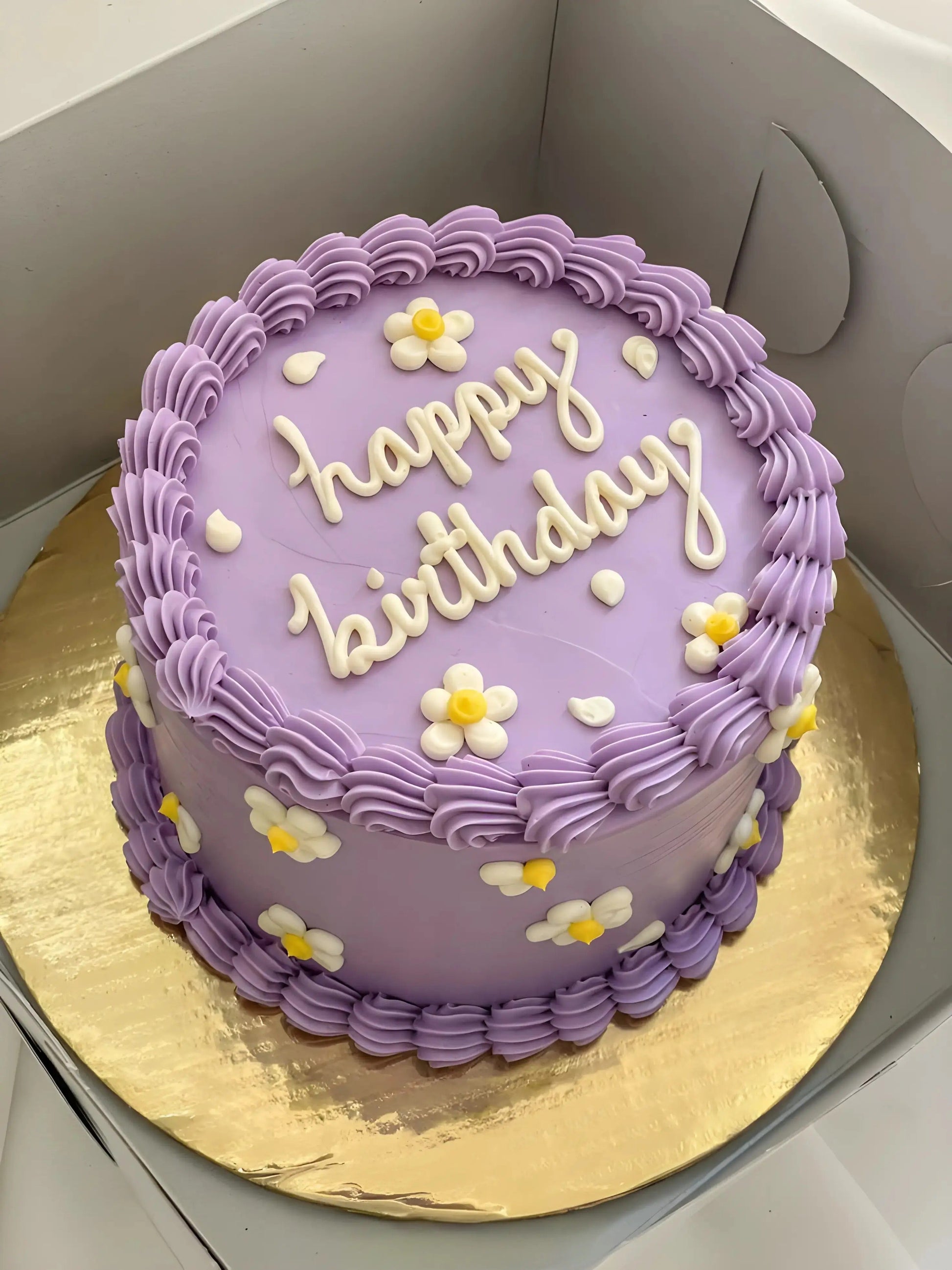 This charming purple cake is adorned with delicate buttercream daisies and a simple "Happy Birthday" message. It's a sweet and elegant way to celebrate a special occasion.
