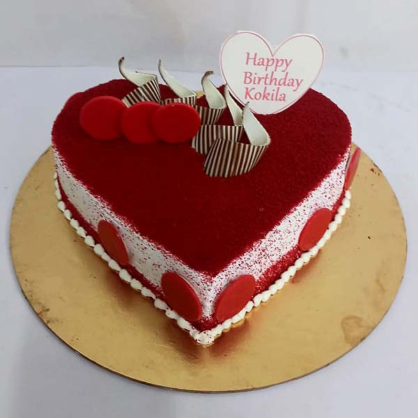 This heart-shaped red velvet cake is a decadent treat for any special occasion. The cake is frosted with a creamy white icing and decorated with red polka dots and a chocolate swirl. A heart-shaped topper with the message adds a personal touch.