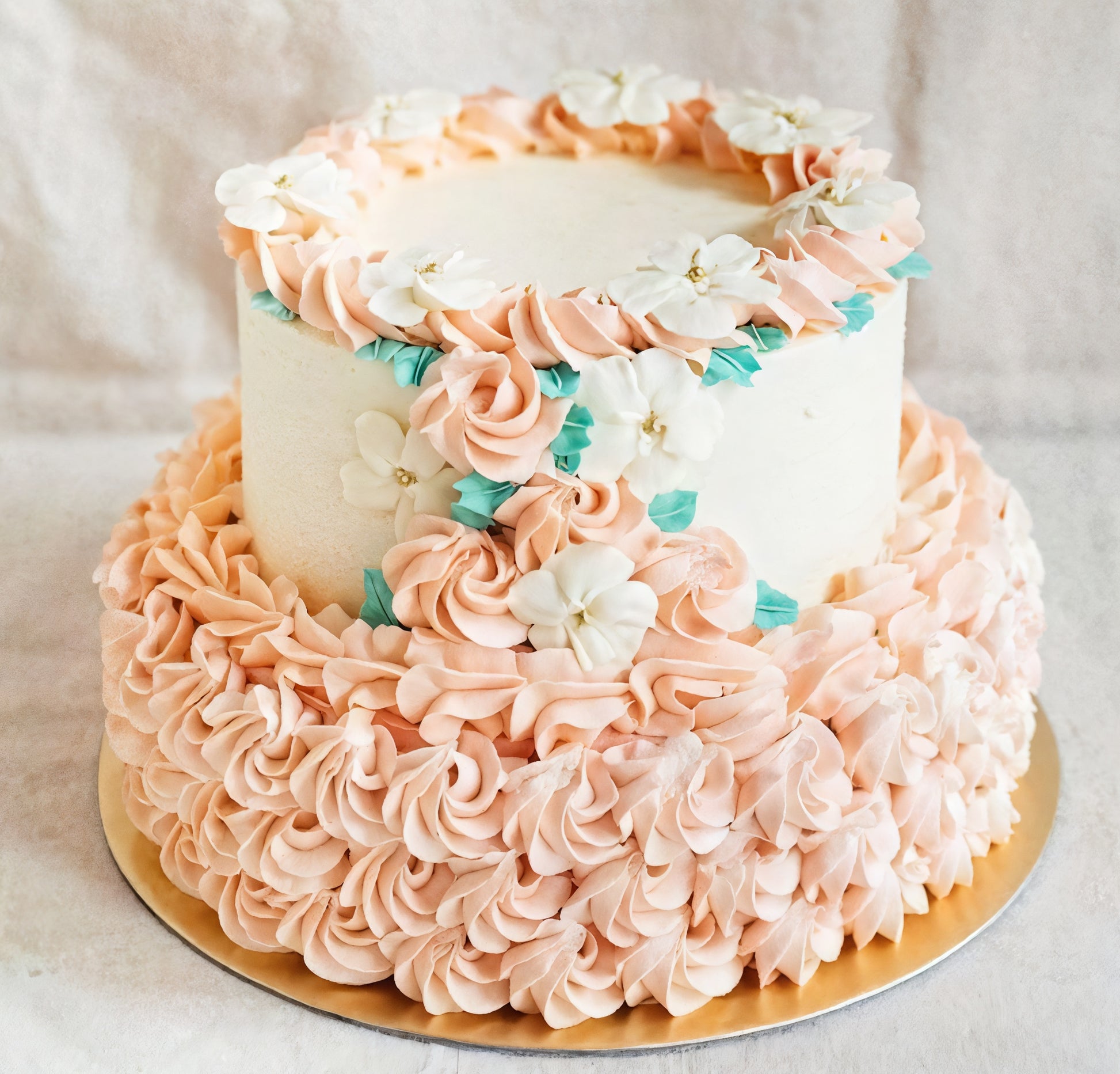 This is a two-tiered cake with a light-colored frosting. The bottom tier is covered in peach-toned, ruffled buttercream swirls. The top tier features a ring of floral buttercream decorations in white, peach, and teal.