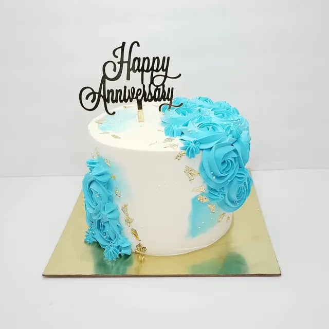 This single-tiered anniversary cake is a delightful blend of textures and colors. Half of the cake is covered in a smooth white buttercream, while the other half is adorned with a cascade of delicate blue piped roses. The white half is further embellished with subtle gold leaf accents, adding a touch of elegance. The cake is topped with a simple "Happy Anniversary" topper, completing the celebratory look.